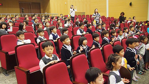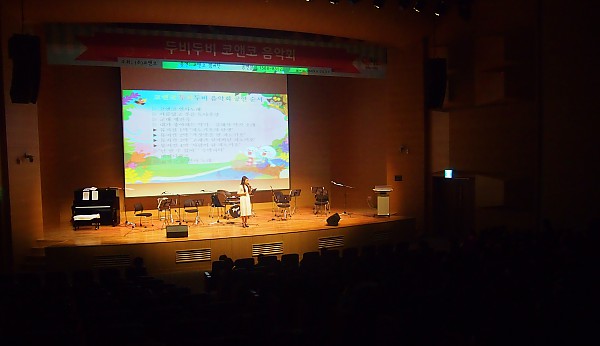 연주팀이 등장하기 전 사회자 선생님이 등장하여 먼저 친구들과 인사를 나누고 있는 모습이네요~