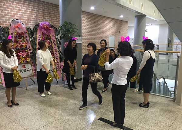귀여운 리본 머리띠를 한 선생님들이