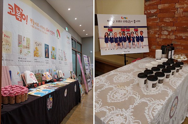 원장님들을 기다리며 준비한 간단한 선물과 예쁘게 진열된 코북이 책들이 돋보이네요.
